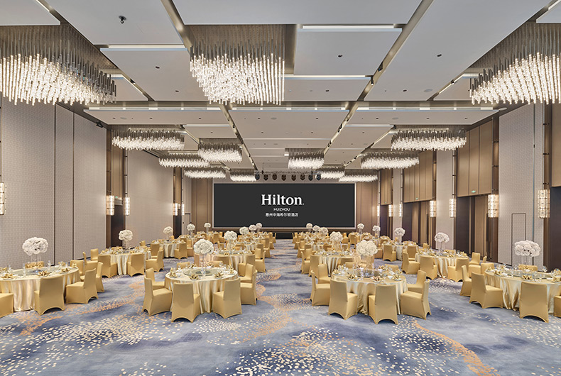 面积750㎡的无柱式宴会厅,大气明亮,灵活的场地空间可容纳400名宾客,也可分割为2个独立的多功能厅。